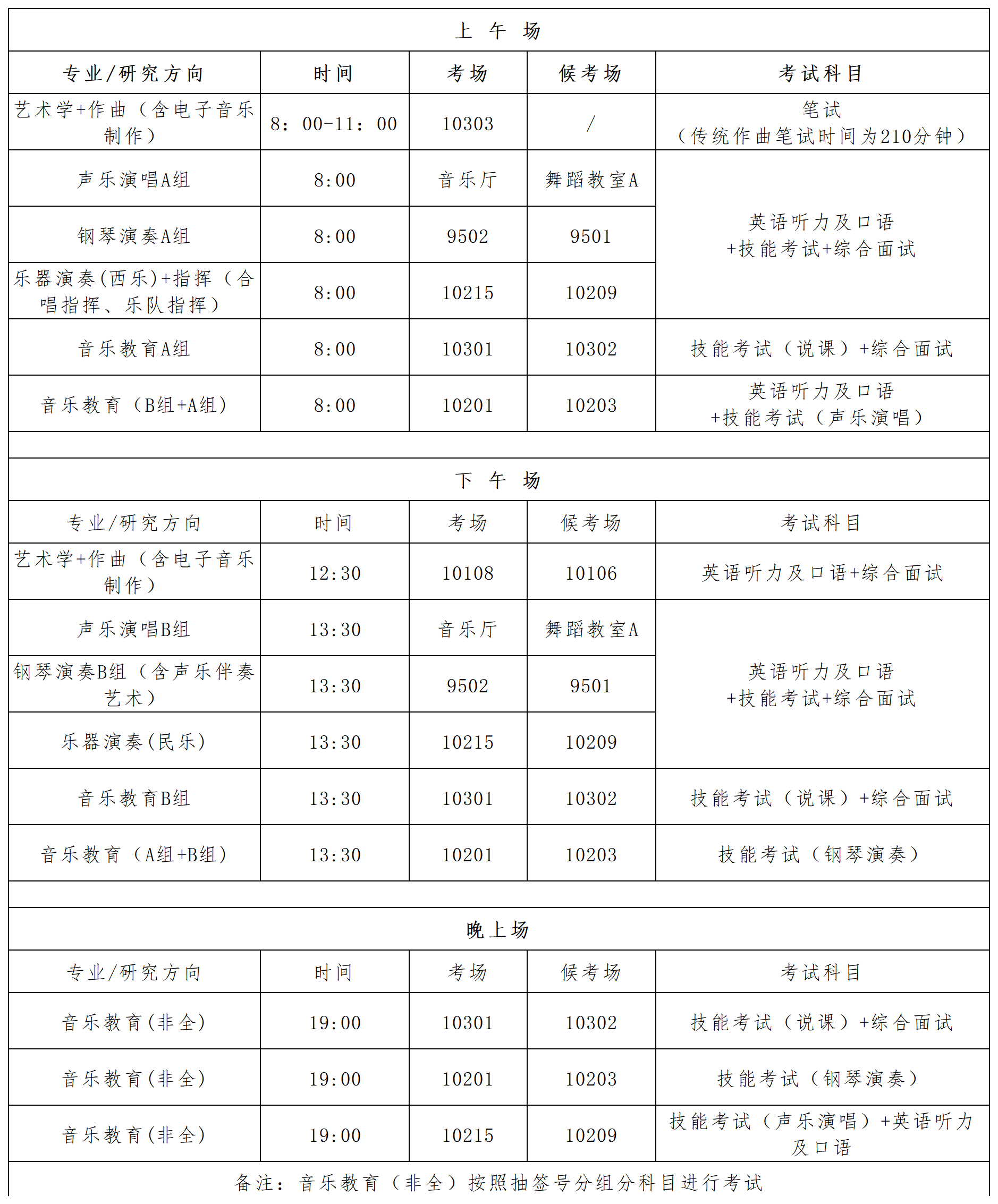 注:声乐演唱、钢琴演奏、音乐教育方向分组情况28日下午抽签决定(集中抽签时间另行通知),同一考场内相同研究方向考生考试顺序由考前现场抽签决定;表中以“10…”开头的考场在音乐学院崇艺楼,9501、9502在尚音楼。